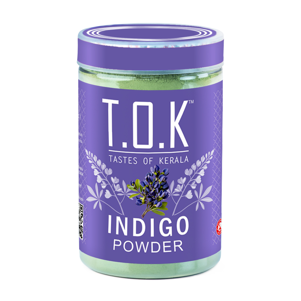 Introducing T.O.K Tastes of Kerala Pure Indigo Powder, made from premium-grade Indigofera Tinctoria leaves carefully sourced and processed to deliver the best natural hair coloring experience. This 100% herbal powder provides a safe, chemical-free alternative to synthetic hair dyes. Indigo powder is widely used as a natural black and brown hair dye when combined with henna or applied after henna. It helps color grey/white hair naturally while nourishing the scalp and improving overall hair texture. Our Indigo powder is free from ammonia, PPD, parabens, preservatives, and artificial fragrances, making it suitable for sensitive scalp and all hair types. It enhances hair strength, reduces dryness and frizz, and gives your hair a smooth, shiny, healthy look. Carefully packed in a 150g airtight bottle, this product ensures long-lasting freshness and purity. Experience the true power of natural hair care with an authentic Kerala herbal formulation from T.O.K Tastes of Kerala. Great for: ✔ Natural black hair dye ✔ Brown hair dye (when mixed with henna) ✔ Covering grey/white hair ✔ Strengthening roots & nourishing scalp ✔ Chemical-free hair coloring