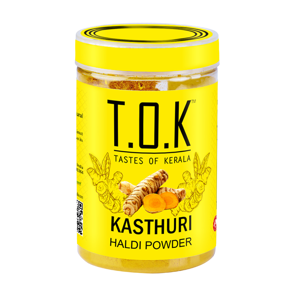 T.O.K Tastes of Kerala Kasturi Haldi Powder is made from the finest wild turmeric roots grown in the lush Western Ghats of Kerala. Known as Kasthuri Manjal, this premium beauty turmeric is widely used in Ayurveda for its powerful skin benefits. Unlike regular turmeric, Kasturi Haldi is non-staining, making it ideal for daily skincare and beauty treatments. This pure, chemical-free powder helps brighten the skin, minimize pigmentation, reduce acne and scars, and leave your skin soft, smooth, and glowing. Perfect for DIY face packs, bridal ubtan, skincare rituals, and natural bath powders. With its strong fragrance, fine texture, and high-quality purity, T.O.K Kasturi Haldi is the perfect addition to your beauty routine.