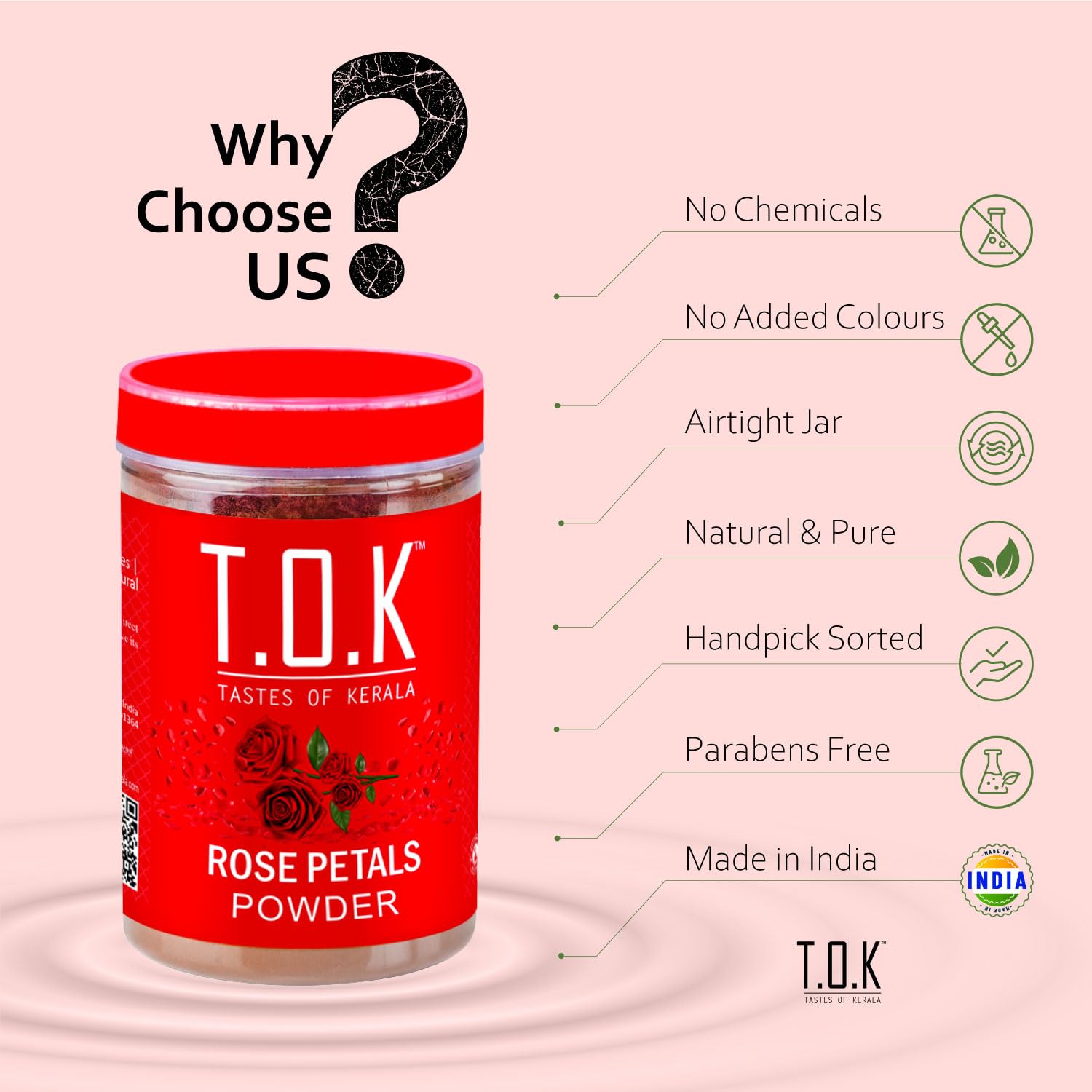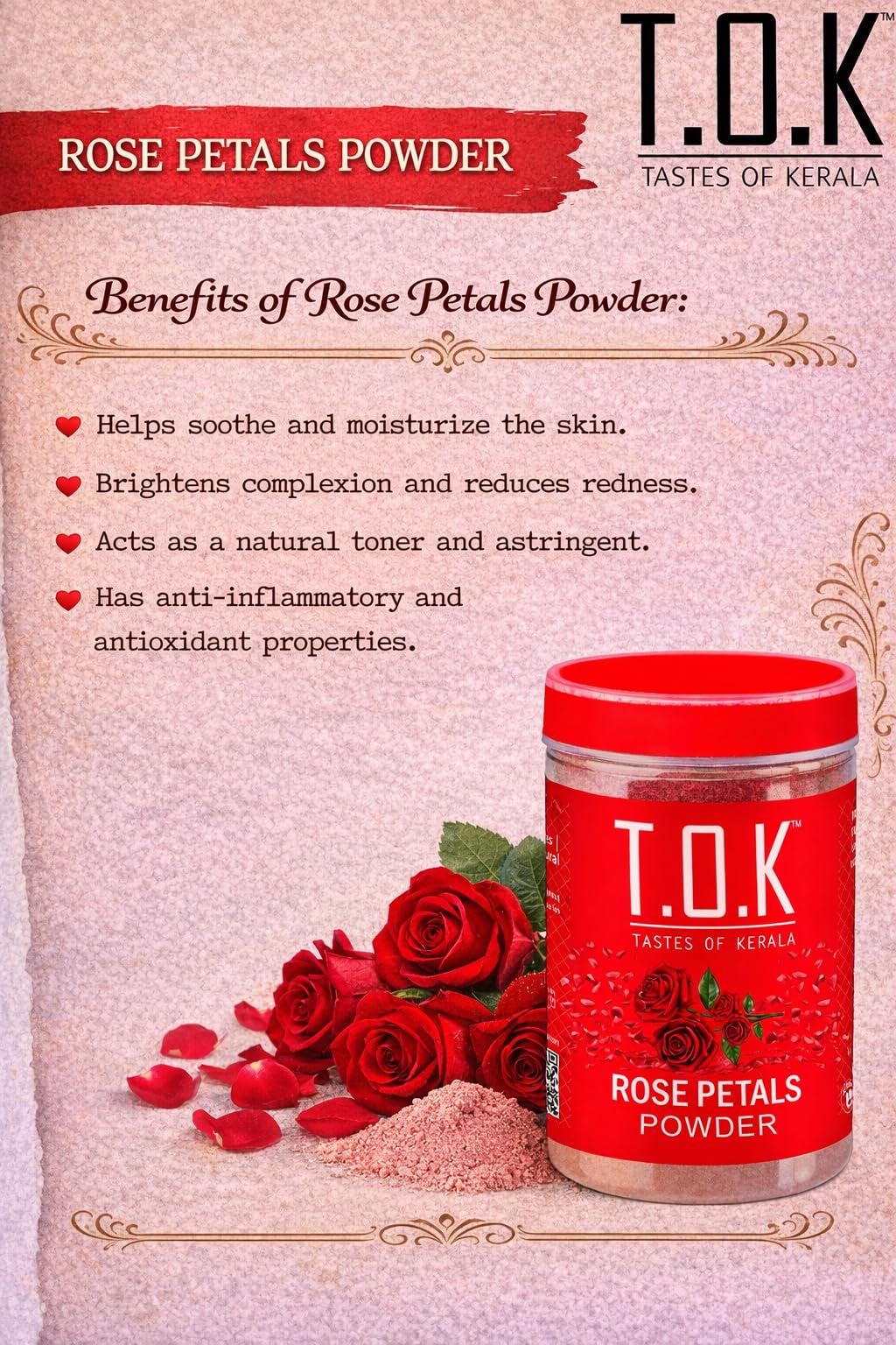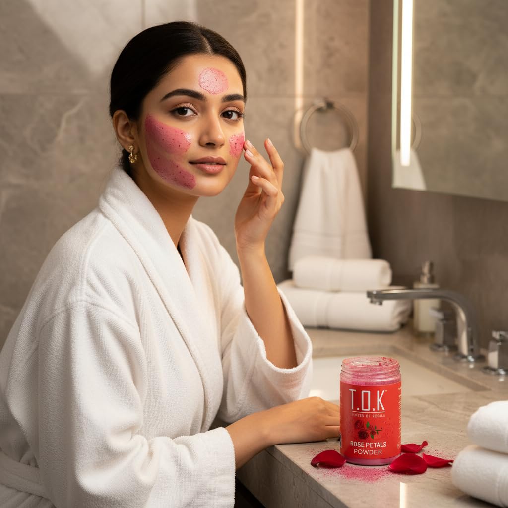 - 100% Pure & Natural Rose Petals Powder Made from premium quality dried rose petals, finely ground to retain natural fragrance, nutrients, and freshness. No chemicals, no added colors, no preservatives.